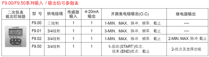 1.按照输出及控制功能选择上述各型号二次仪表/批次控制器。例如F9.01、9.02、9.50